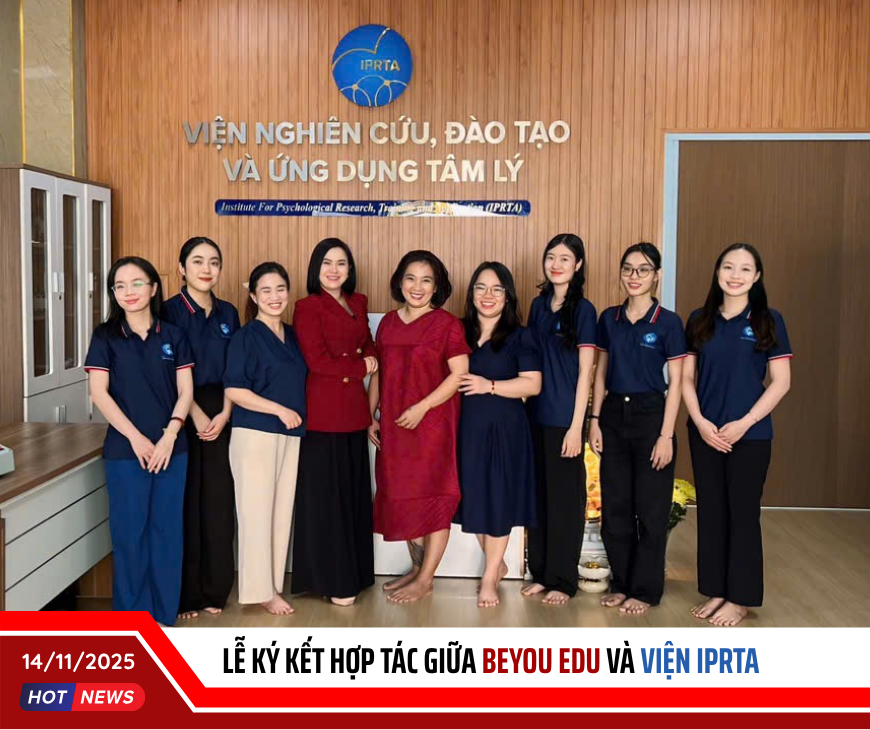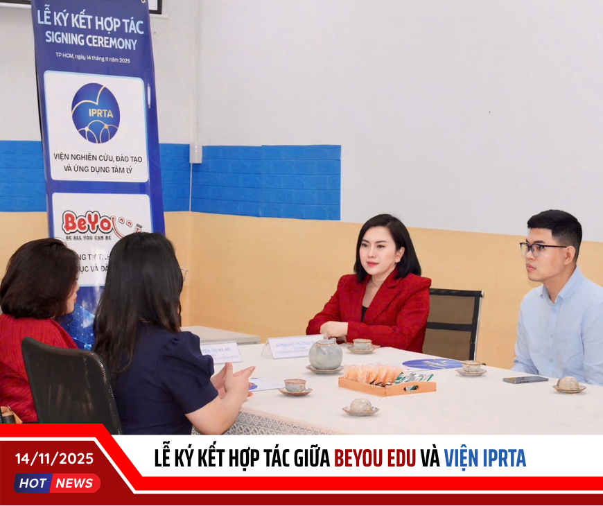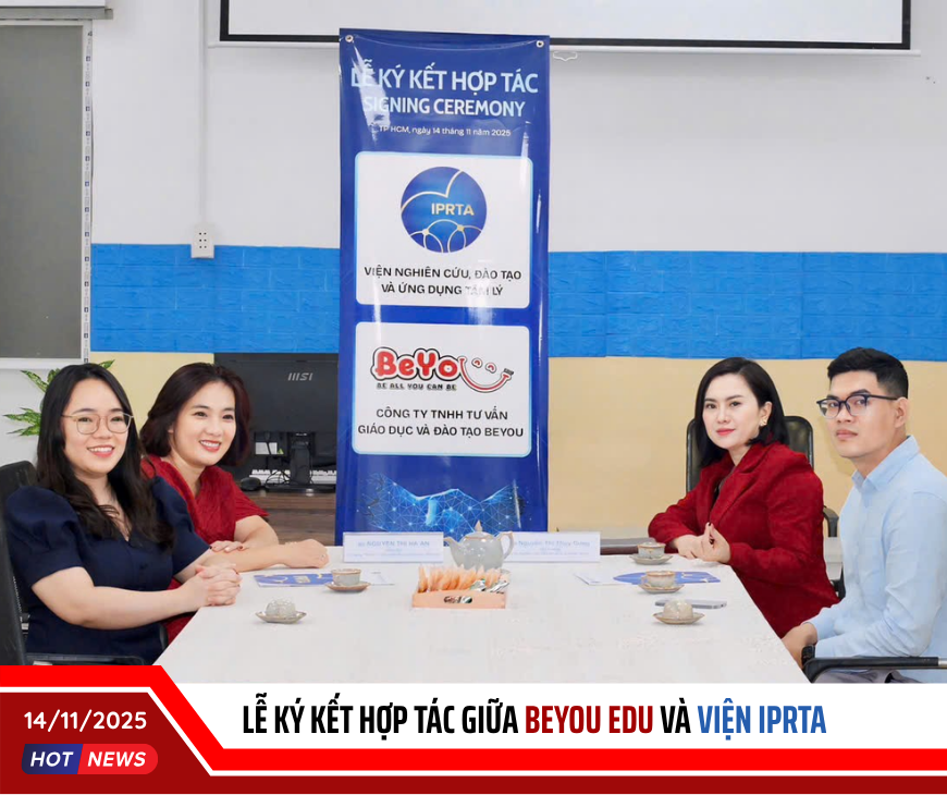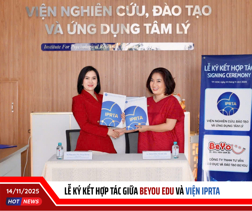 Sáng ngày 14 tháng 11 năm 2025, Công ty TNHH Tư vấn Giáo dục và Đào tạo BeYou (BeYou Edu) đã chính thức tổ chức Lễ ký kết hợp tác chiến lược với Viện Nghiên cứu, Đào tạo và Ứng dụng Tâm lý IPRTA. Sự kiện quan trọng này diễn ra lúc 10h00, mở ra một chương mới trong lĩnh vực giáo dục và tâm lý học ứng dụng tại Việt Nam.